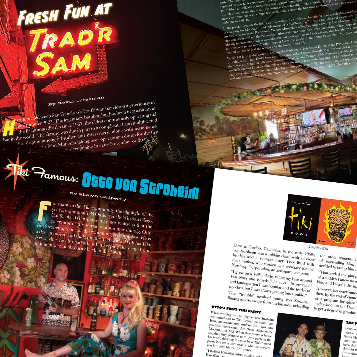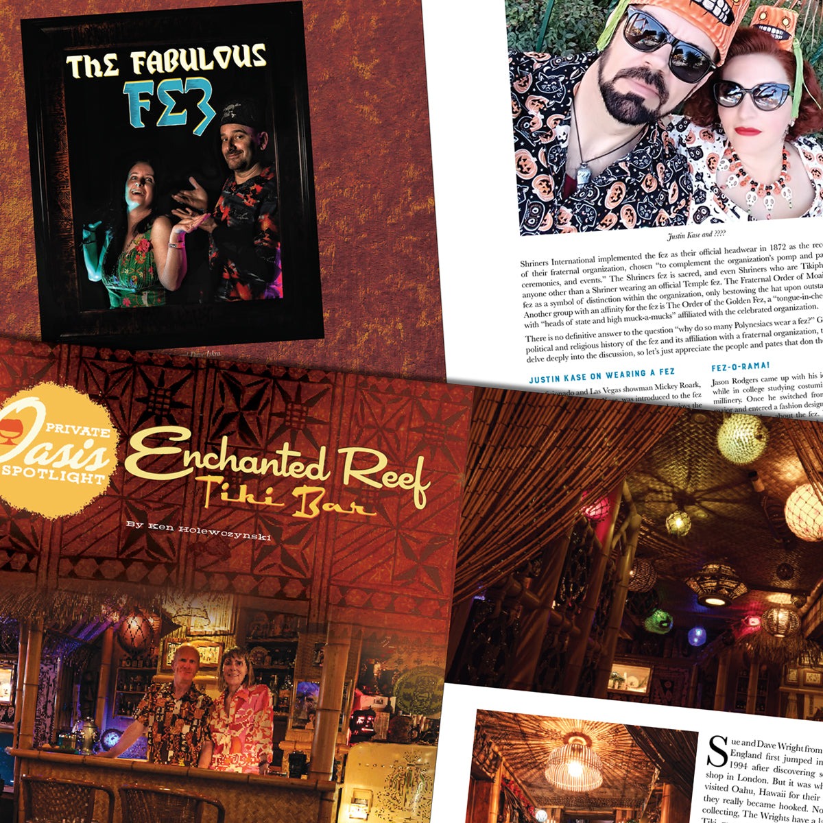 The age-old question of just what is up with the fez, is the subject of Anna Maria Sophia Cancelli’s article “The Fabulous Fez,” and Kevin Crossman makes a stop at San Fransisco’s venerable dive Tiki bar, Trad’r Sam to check up on the recent updates there.