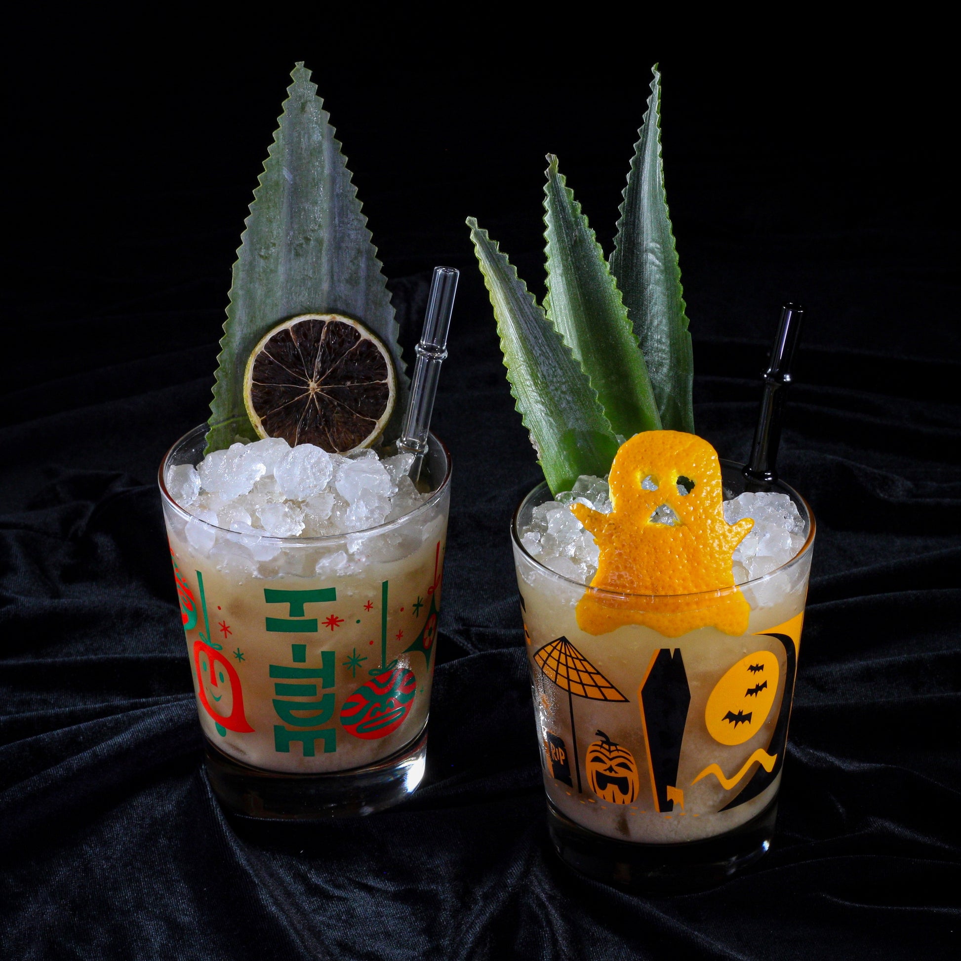 • Set includes 1 Halloween (black/orange) and 1 Christmas (red/green) cocktail glass