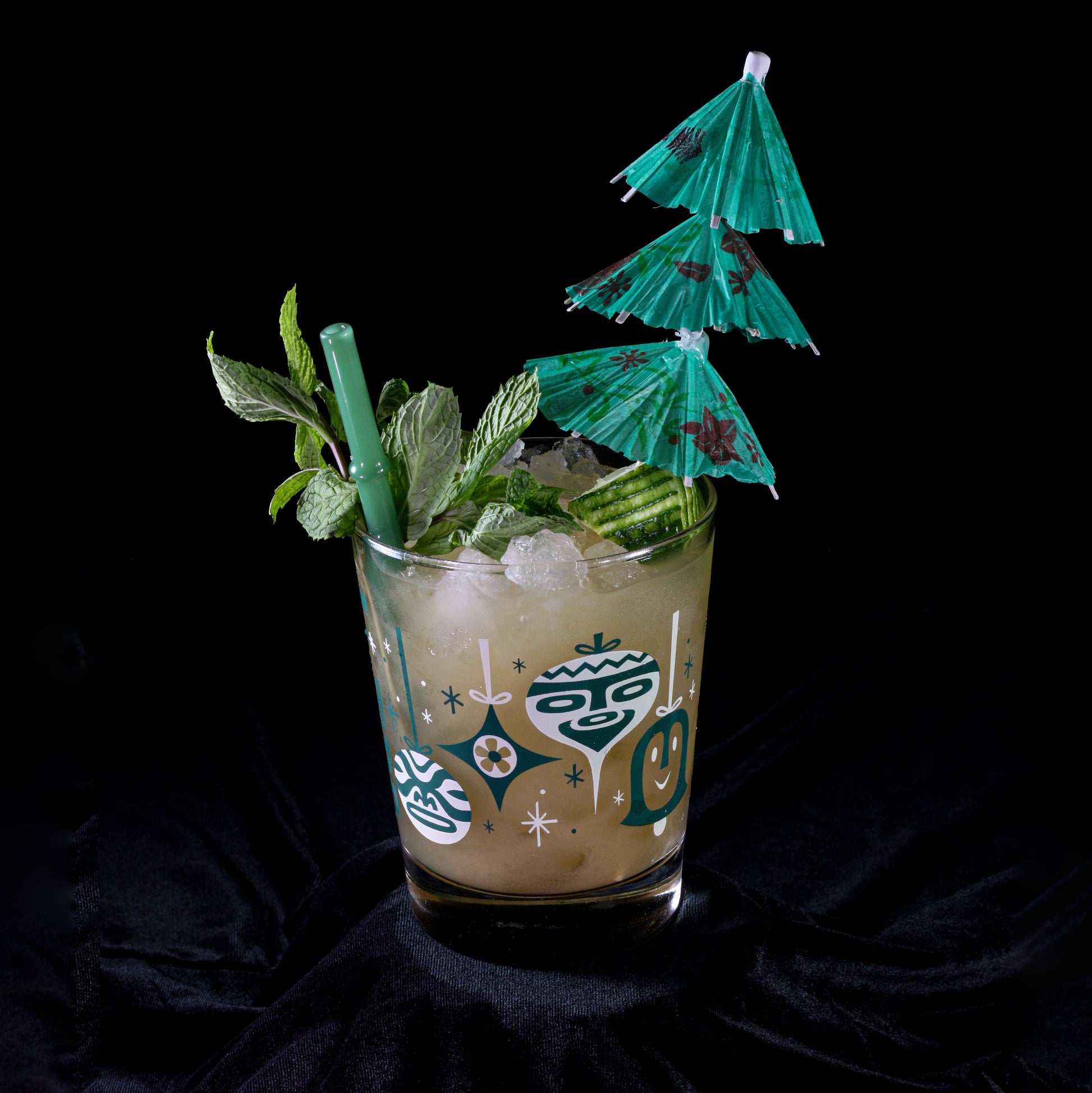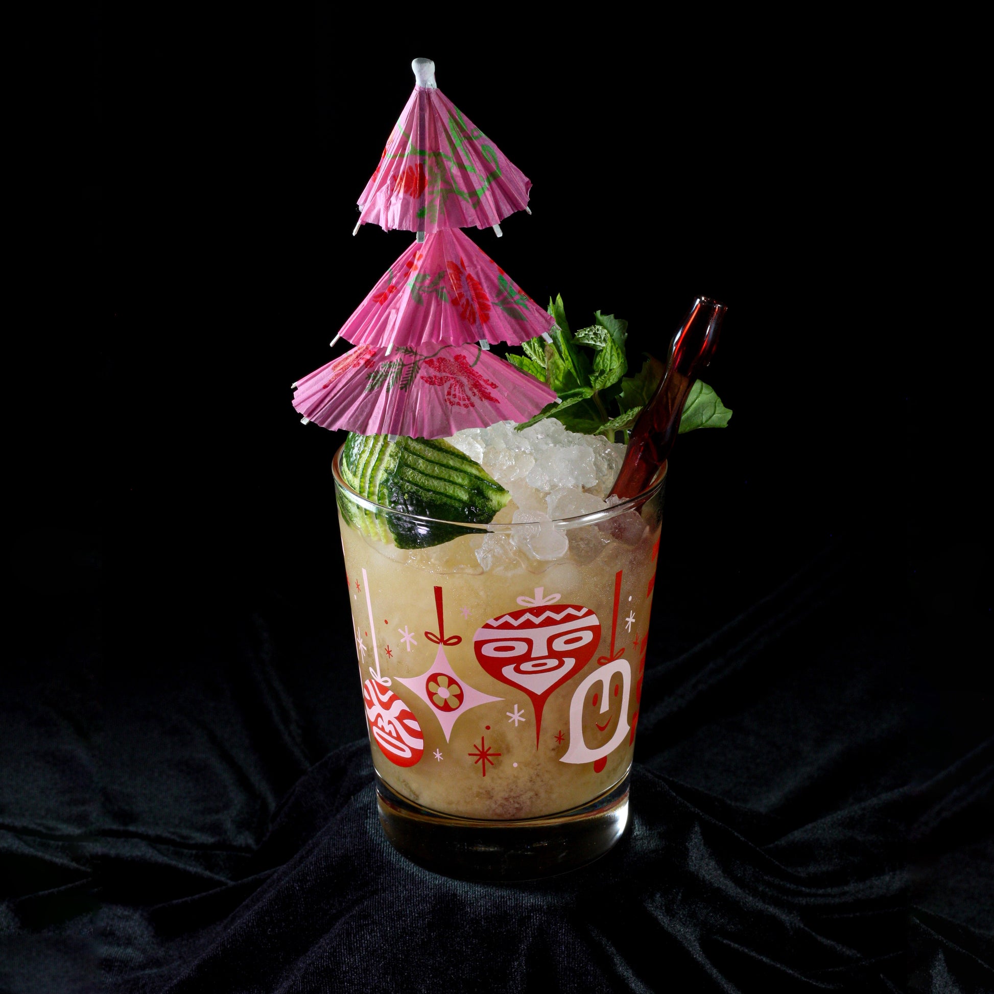 Heavy duty, double old-fashioned style cocktail glass set with festive artwork by the great Fred Lammers!